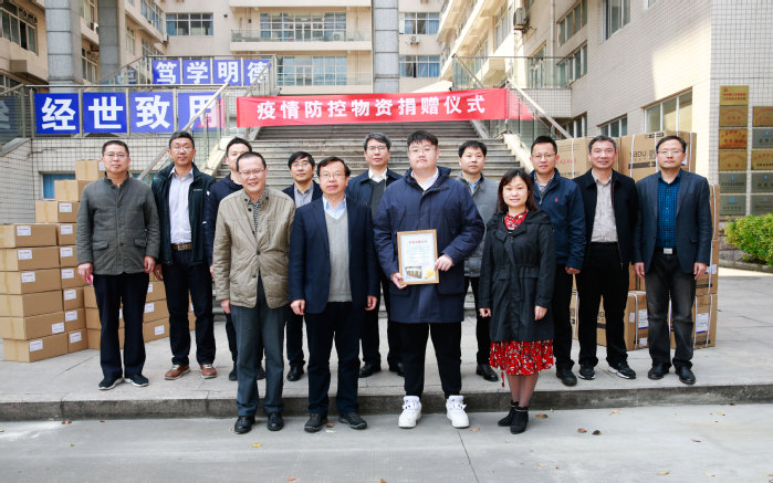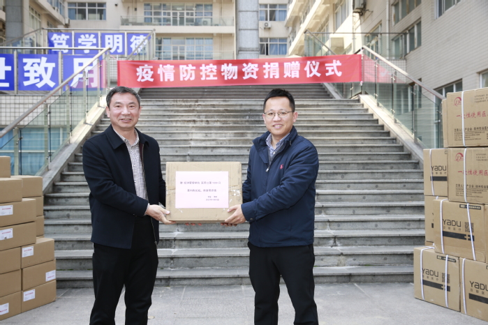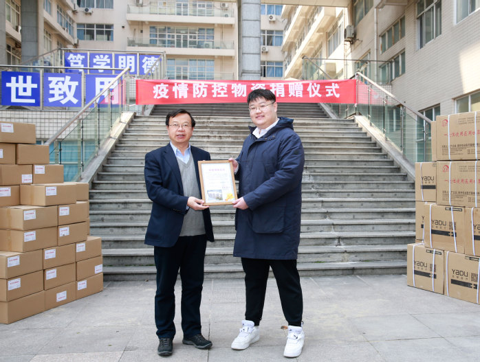 众志成城,爱心传递。在捐赠仪式上,经济管理学院在校研究生李琪同学也向学校捐赠医用口罩1000只,教育发展基金会秘书长生佳根代表捐赠人向经管学院捐赠防疫物资,经管学院党委书记王念新接受捐赠。