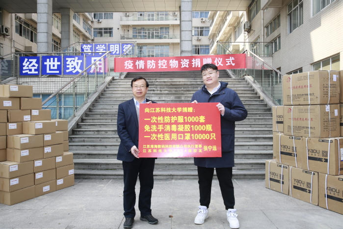 4月8日上午, 举行疫情防控物资捐赠仪式,2014届优秀校友、江苏淮海数码科技有限公司执行董事张宁远向学校捐赠疫情防控物资助力开学,这批捐赠物资包含一次性医用口罩10000只、一次性防护服1000套、免洗手消毒凝胶1000瓶。