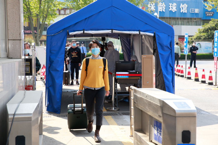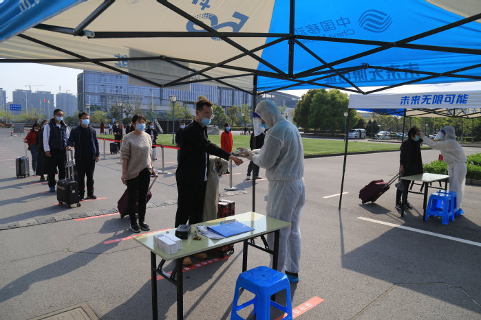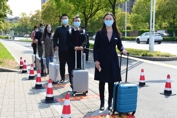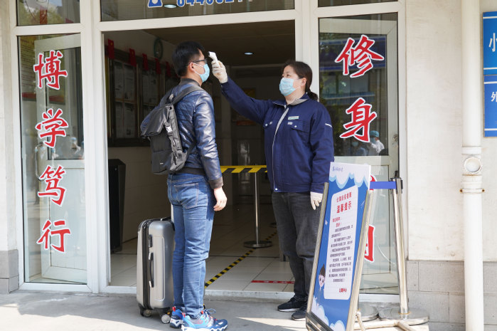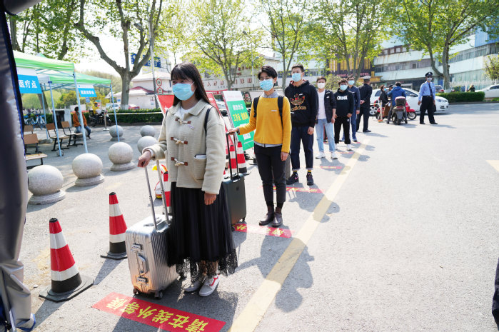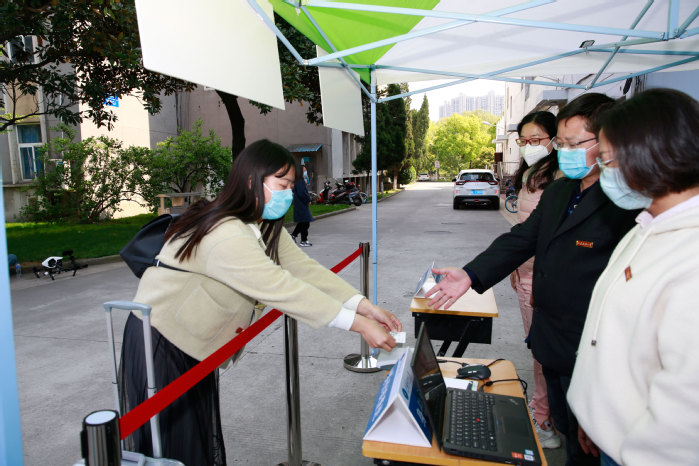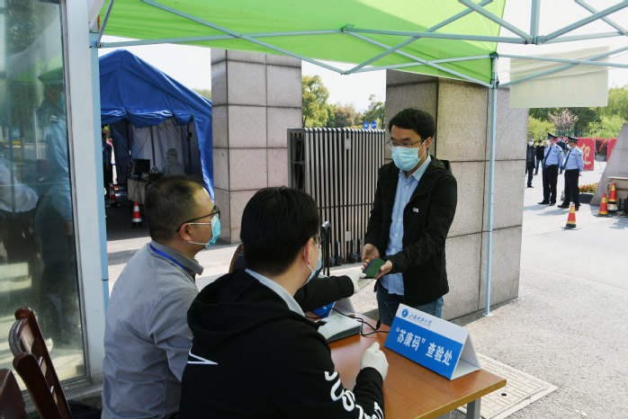 “ 疫情防控演练开始。” 4月15日下午14:30,随着校领导一声令下,一队辅导员扮演的返校学生统一佩戴口罩,保持安全距离,有序通过校门口测温点。随后听从引导进入身份证和苏康码查验点,完成“一测二查三核”流程后进入校园,步行至宿舍区大门处接受第二次测温,再凭借校园卡刷卡通关进入宿舍。
