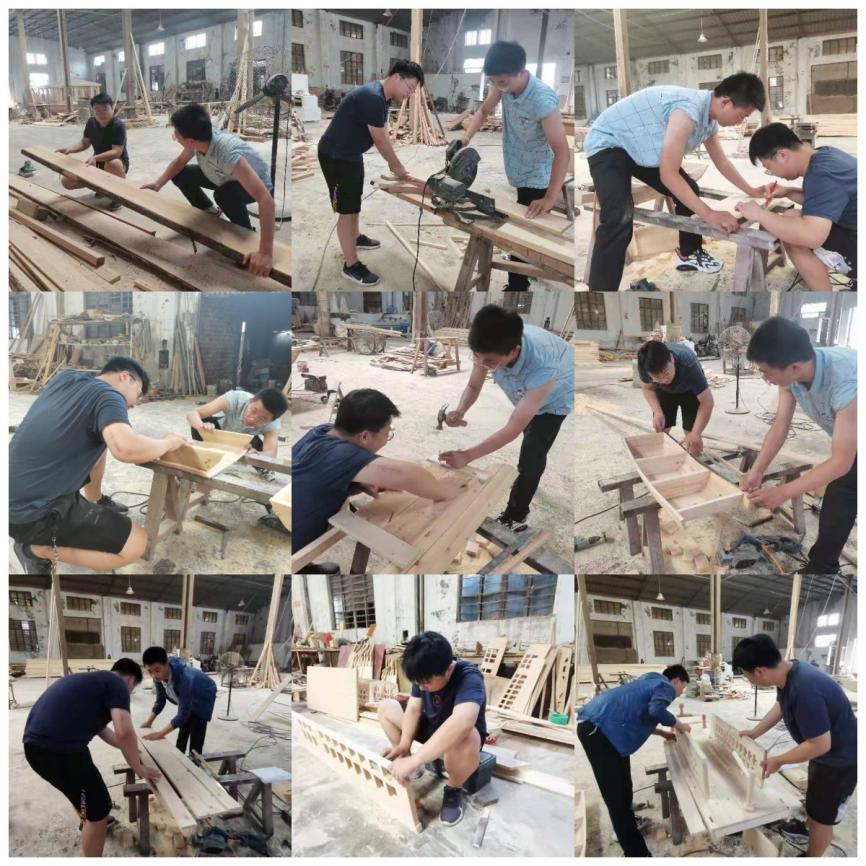 在图纸设计工作完成后,便是红船实物模型的制作。要做好一艘红船模型,要在功能性、原材料、制作工艺等方面有所讲究,尽可能按照真正的红船制作流程来制作,这样才能够在形制相似的基础上兼具“精气神”。为了做到这一点,船海专业的王文庆和施琦等人在细节方面下足了功夫,无论在板材的选择以及后续的切割、打磨、雕刻、组装过程,都凭借着精益求精的工匠精神,尽心雕琢着这件艺术品。