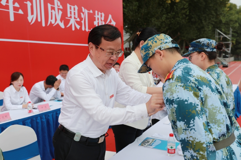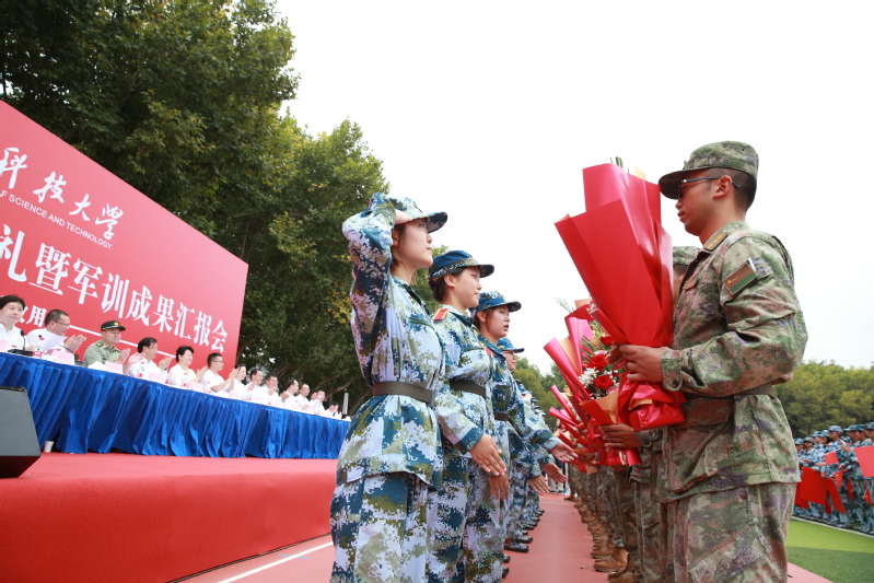 军训成果汇报后,学生代表为22位现役教官敬献鲜花。