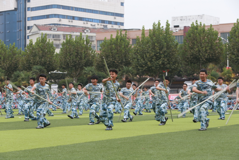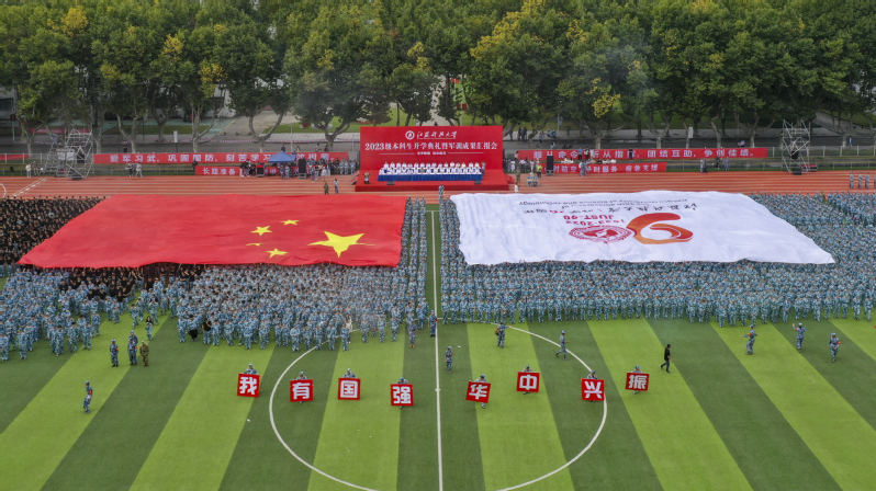 在军事技能展示环节,首先出场的是字母方阵。一千余名同学变换摆出各式字样,祝贺江科大办学90周年。大型团体操《航向深蓝》中,530名学生组成的战船方阵伴随着演绎的惊涛骇浪蓄势待发,依次展示学校英文名称缩写和校徽图案。“一丝不苟争当训练标兵,意志坚定勇于迎难而上”。战术方阵展示了战术救护军事技能。全旅各营推荐选拔出来的军训精兵,以精彩的战术动作展示训练成果。他们针对不同场景灵活变换队形,隐蔽自身、靠近障碍、精准打击、规避威胁、救助伤员。最后出场的格斗术方阵呈现了精彩的格斗术表演。