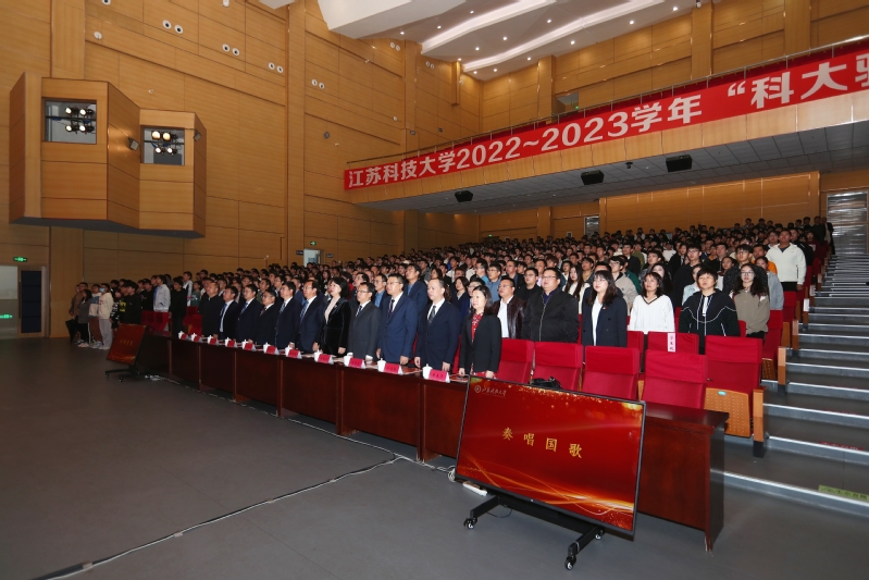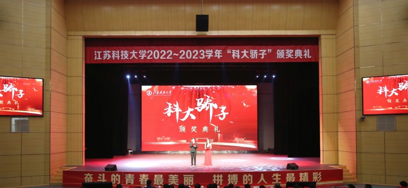11月9日, 在长山校区船苑剧场举行2022-2023学年“科大骄子”颁奖典礼,表彰在“德、智、体、美、劳”等方面有突出表现、受到省级以上奖励的先进个人和集体。校领导周南平、嵇春艳、潘锦全、安祥卫、李木旺、施伟东、周宏根、叶永林,相关职能部门、各学院负责人,全体辅导员和在校学生参加典礼。