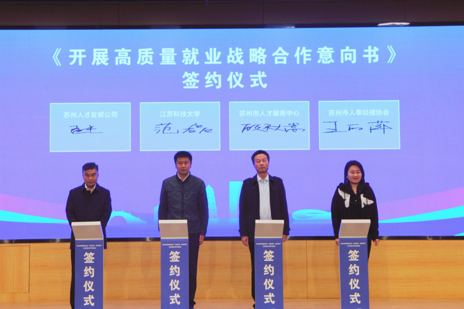 随后,学校与苏州市人才服务中心、苏州人才发展公司、苏州市人事经理协会四方共同签署了“开展高质量就业战略合作意向书”,并宣布“苏州人才驿站”正式启用。