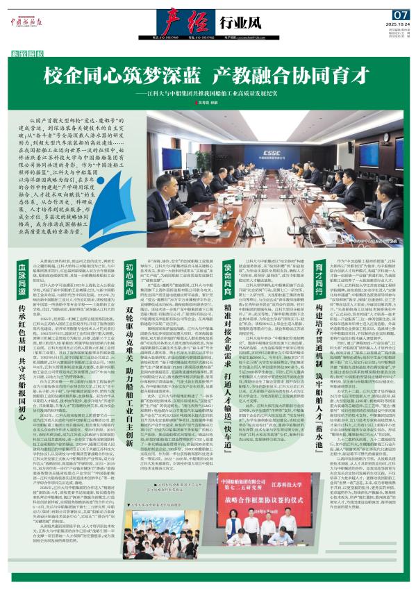 从国产首艘大型邮轮“爱达·魔都号”的建成营运,到深海装备关键技术的自主突破;从“奋斗者”号全海深载人潜水器的研发助力,到超大型汽车滚装船的高效建造……在我国船舶工业迈向世界一流的征程中,始终活跃着 与中国船舶集团有限公司协同共进的身影。作为“中国造船工程师的摇篮”,江科大与中船集团以海洋强国战略为指引,在多年的合作中构建起“产学研用深度融合、人才技术双向赋能”的生态体系,从合作历史、科研成果、人才培养到就业服务,形成全方位、多层次的战略协同格局,成为推动我国船舶工业高质量发展的重要力量。