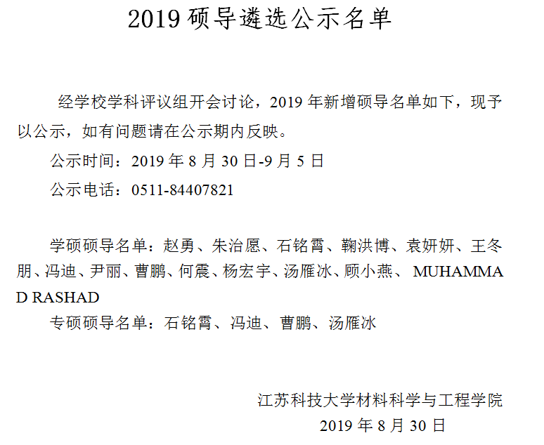 公示:材料学院2019硕导遴选公示名单
