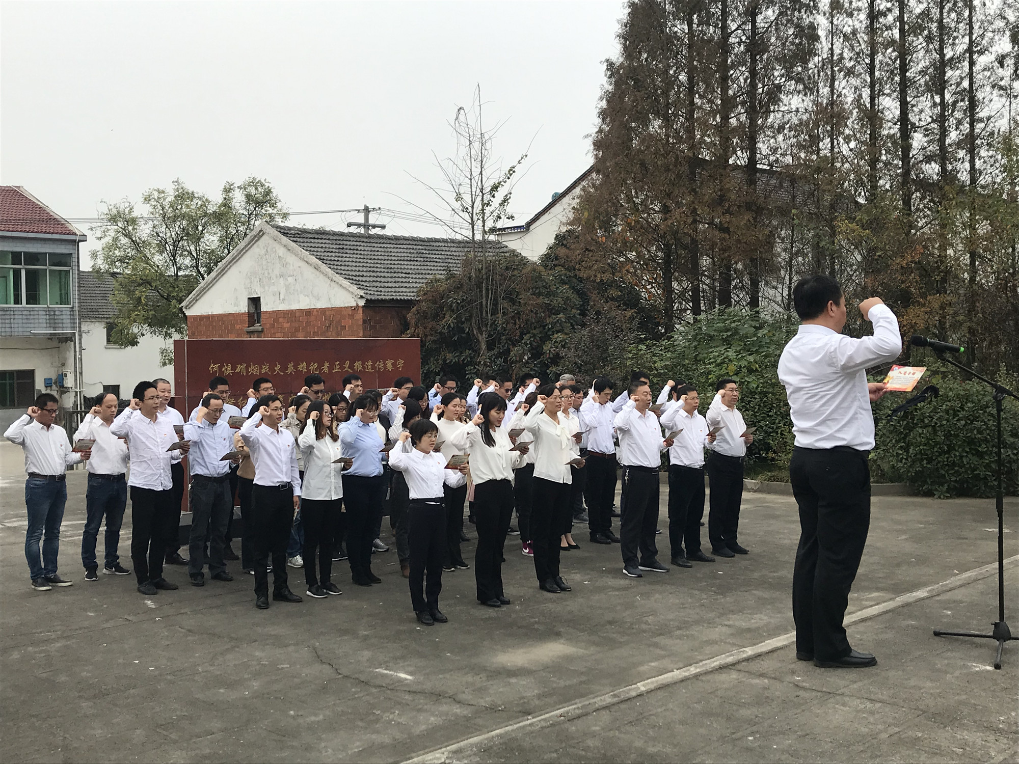 “我志愿加入中国共产党……”,许杏虎烈士纪念馆前,在学院党委书记祁凯的领誓下,47名教师党员面对鲜红的党旗,身着白色衬衣,佩戴党员徽章,高举右拳,字字铿锵,重温入党誓词,永葆入党初心,彰显了学院全体党员不忘初心、牢记使命的坚定政治信念。