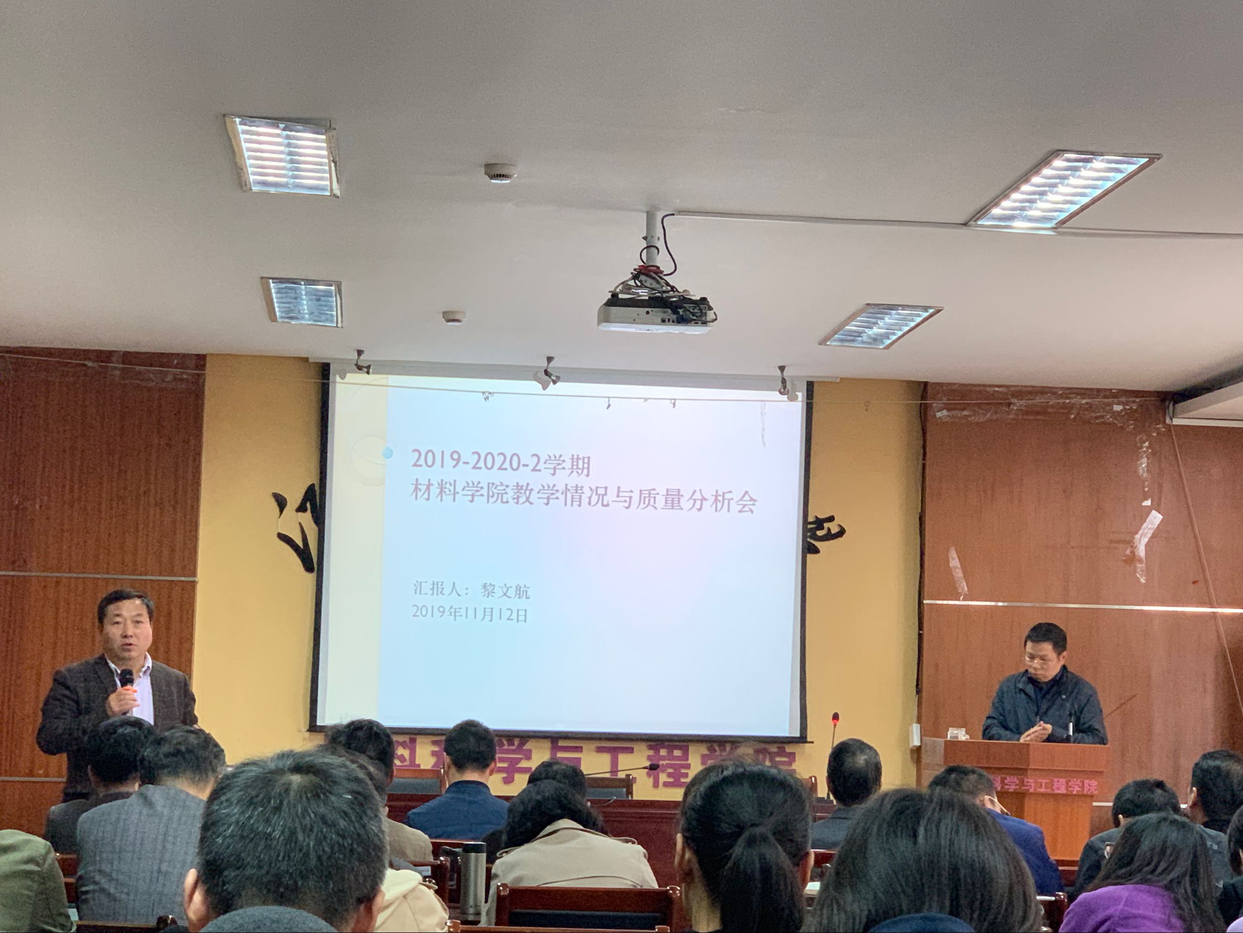 2019年11月12日下午,材料学院在院报告厅召开2019-2020学年第1学期教学情况与质量分析会,全体院领导及全体教师参加。会议由学院党委书记祁凯主持,祁书记首先简要总结了今年学院在教学工作上取得的成果,对全体教师的努力表示感谢。副院长黎文航做了关于学院教学情况与质量分析会的报告。