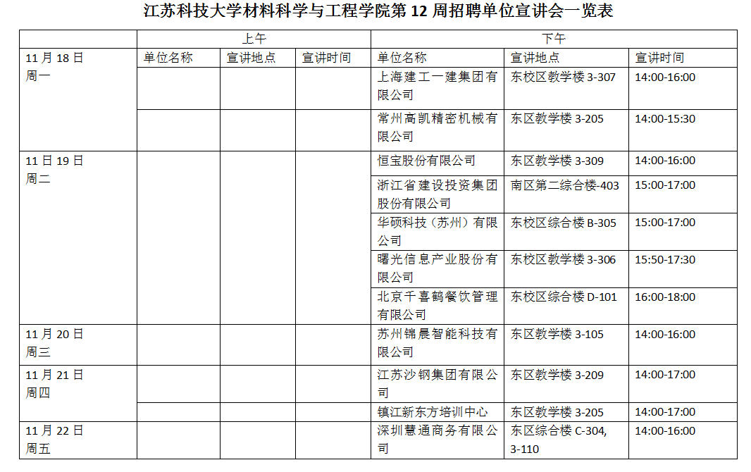 招聘会|材料学院下半年第12周招聘单位宣讲会一览表(2019年11月18日)
