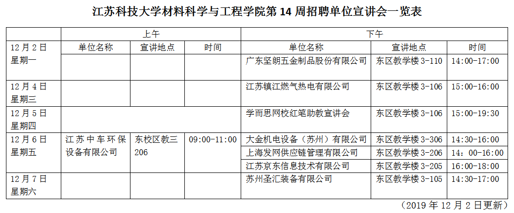 招聘会|材料学院下半年第14周招聘单位宣讲会一览表(2019年12月2日)