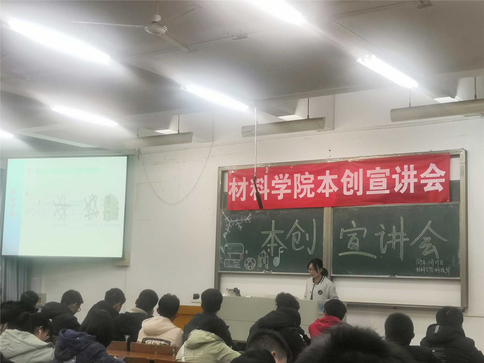 11月26日,材料学院研究生第二、三支部共同在西校区举办了关于“大学生创新科研项目”的讲座。参加本次活动的有材料学院大二、大三的莘莘学子。汇报人分别为17级博士研究生于瑞、17级研究生路芳和16级研究生叶飞。他们对各自的科研项目或参与的“创新杯”做了详细的介绍,与学弟学妹们积极互动,并为他们分享了心得体会。
