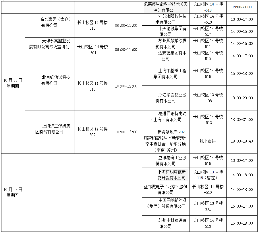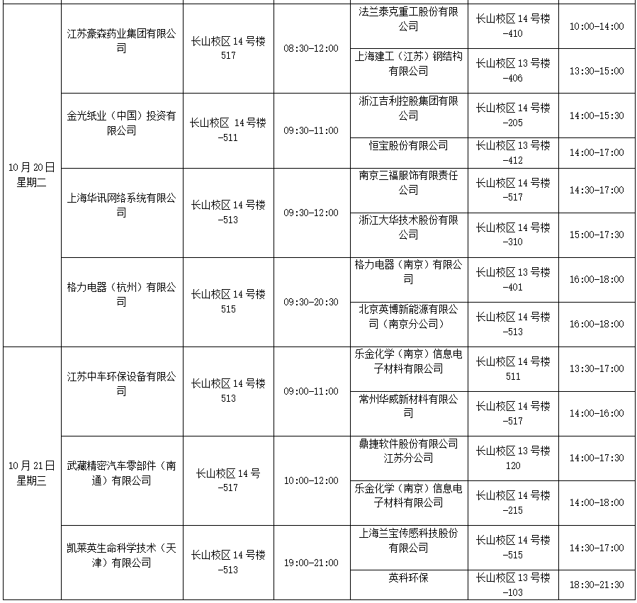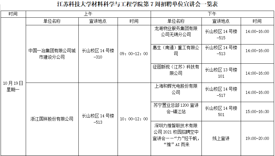 材料科学与工程学院第7周招聘单位宣讲会一览表(2020年10月19-23日)