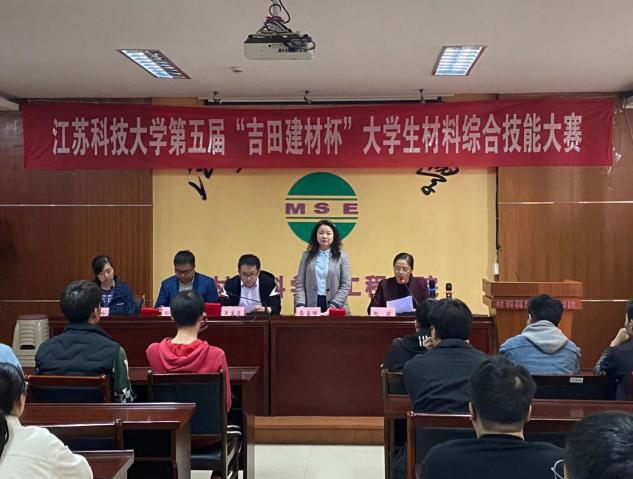 10月24日, 第五届“吉田建材杯”大学生材料综合技能大赛在梦溪校区材料学院大会议室隆重开幕。本次大赛由吉田建材(苏州)有限公司赞助, 教务处主办,材料科学与工程国家级实验教学示范中心承办,金属热处理工艺协会协办。材料学院院长芦笙,教务处副处长陆鸿飞,材料学院副院长王宇鑫,吉田建材(苏州)有限公司人力资源部龚蓉晖部长、人力资源科孙亚科长及大赛评审委员会老师参加,开幕式由材料学院党委副书记赵莉主持。