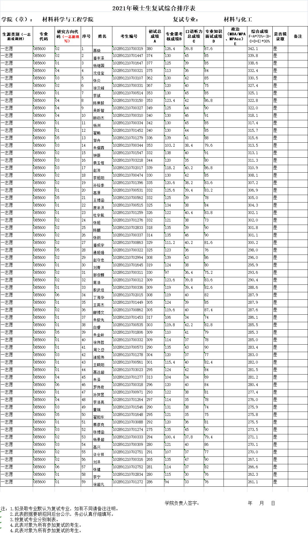 考研公示|材料学院2021年硕士生复试综合排序表(一志愿)