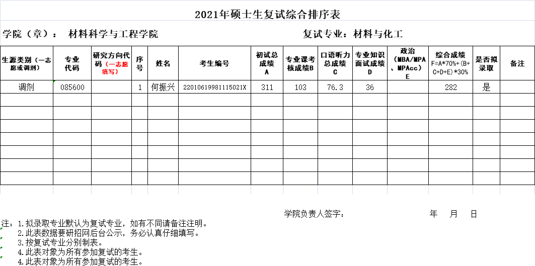 考研公示|材料学院2021年硕士生(第八批)调剂复试成绩排序表