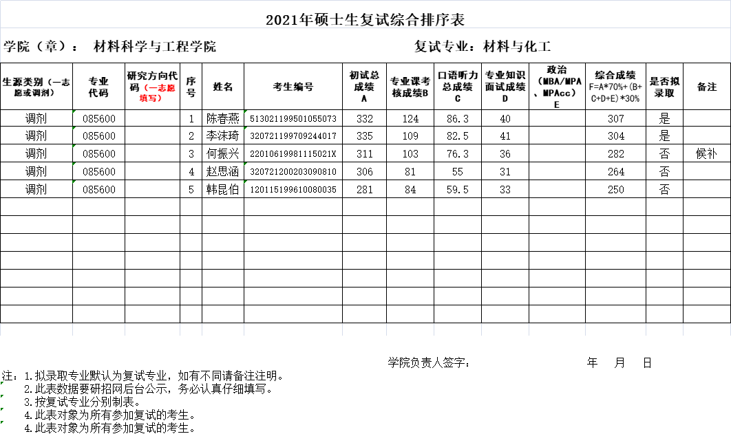 考研公示|材料学院2021年硕士生(第七批)调剂复试成绩排序表