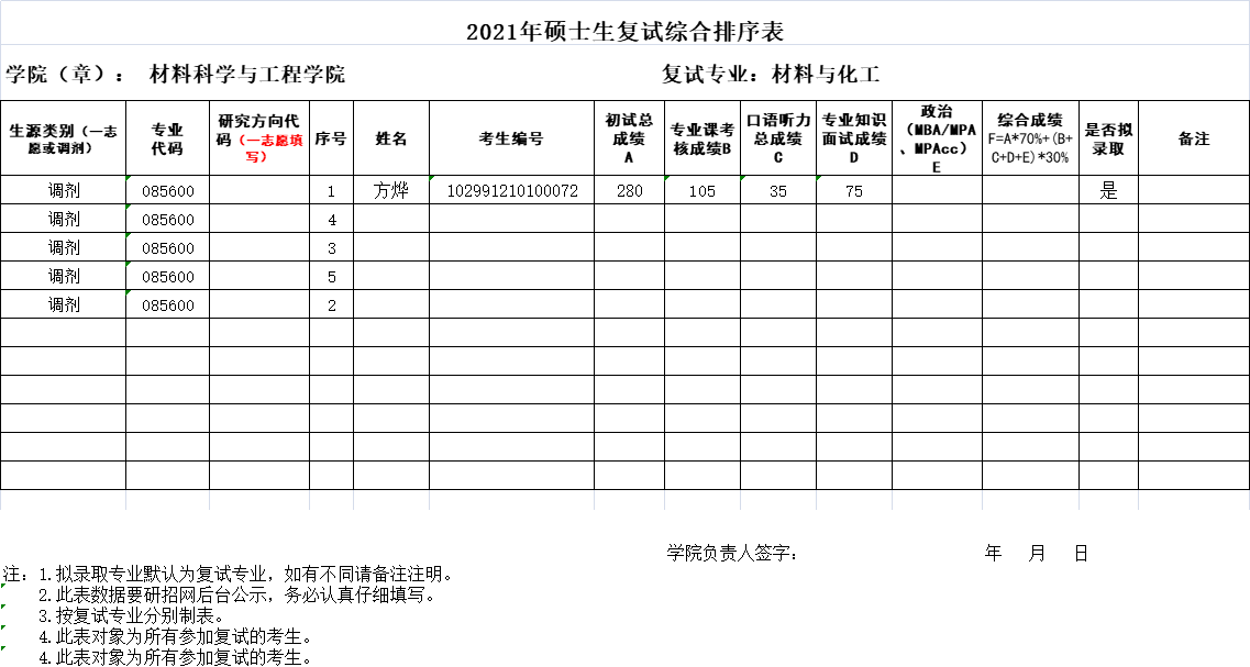 考研公示|材料学院2021年硕士生(第六批)调剂复试成绩排序表