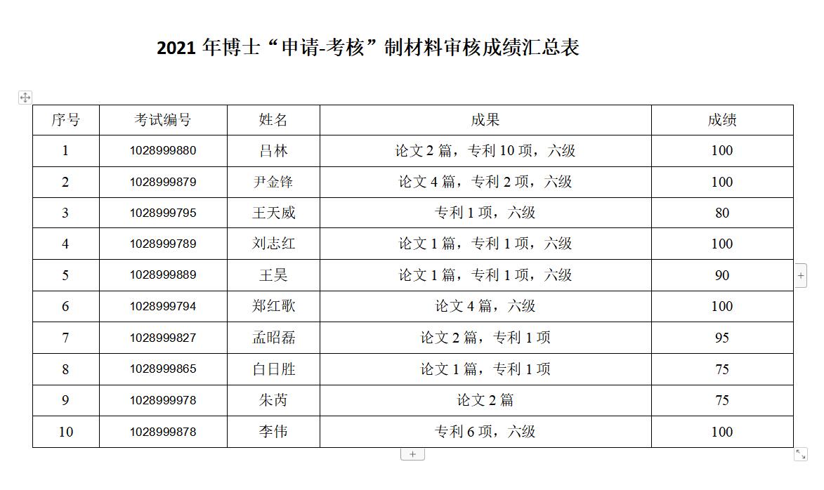 2021年博士“申请-考核”制材料审核成绩汇总表