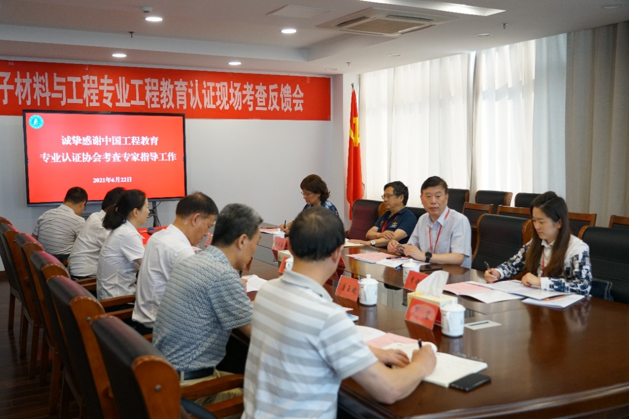 6月22日下午, 高分子材料与工程专业工程教育论证现场考查专家意见反馈会在行政楼8楼会议室召开。专家组成员、学校党委书记葛世伦、副校长任南以及、学校相关职能部门和材料学院负责人、专业负责人,以及专业教师代表参加了反馈会。