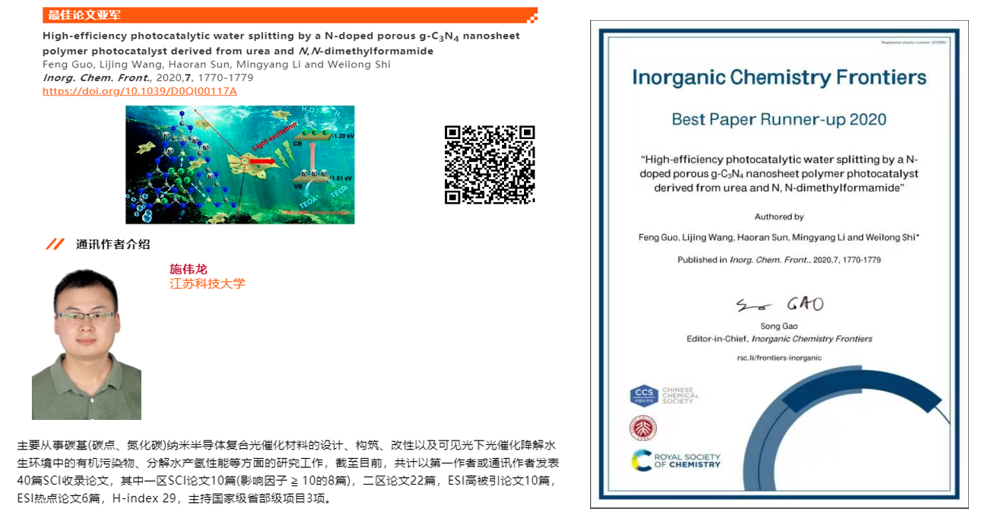 近日,中国化学会和英国皇家化学会联合发布了旗下期刊《Inorganic Chemistry Frontiers》(无机化学前沿)Runningupbestpaper-2020(2020年度最佳论文)榜单。我校材料学院施伟龙副教授为通讯作者发表的“High-efficiency photocatalytic water splittingby a N-doped porous g-C3N4 nanosheetpolymer photocatalyst derived from ureaand N,N-dimethylformamide”论文荣获最佳论文亚军奖。同时,该推文报道也在中国化学年会第32届学术年会现场和英国皇家化学会的官方网站进行推送和发布。