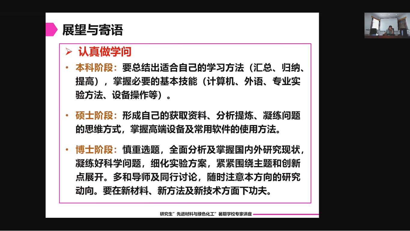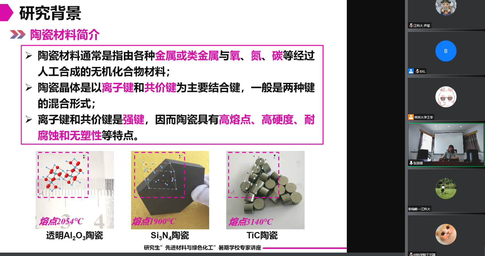 7月27日下午,为拓宽研究生学术视野,实现优势互补、资源共享,由 材料学院承办的“先进材料与绿色化工”暑期学校邀请哈尔滨工业大学的张丽霞教授做专题学术报告。报告会由材料学院芦笙教授主持,报告采用线上的方式进行,省内外高校 300余名师生参会。