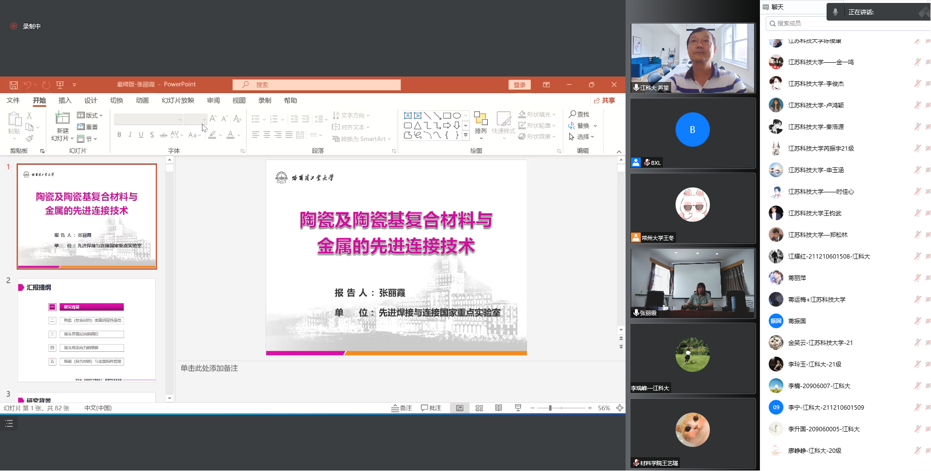 张丽霞教授线上报告题为“陶瓷及陶瓷基复合材料与金属的先进连接技术”。她从陶瓷及陶瓷基复合材料与金属的先进连接技术的研究背景展开,从基本概念开始,由浅入深,聚焦提高陶瓷(复合材料)表面润湿性,缓解接头残余应力,介绍了团队在陶瓷(复合材料)与金属构件焊接等方面开展的研究和探索。