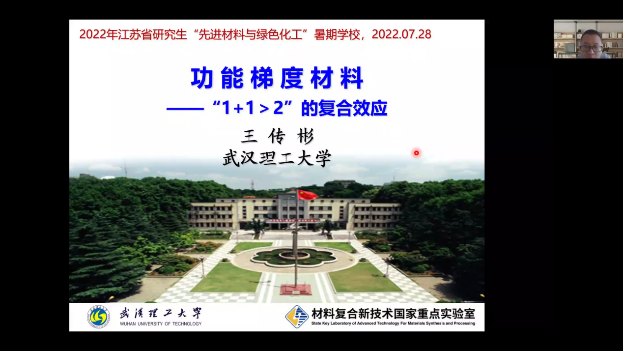 7月28日上午, 和常州大学联合举办的2022江苏省研究生“先进材料与绿色化工”暑期学校在线上隆重举行,本次会议邀请了武汉理工大学王传彬教授,给我们带来了《功能梯度材料——“1+1>2”的复合效应》的主题报告,本次报告会省内外多个高校的研究生和青年教师参加,会议由副院长王宇鑫教授主持。