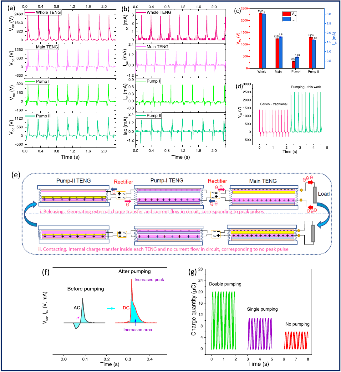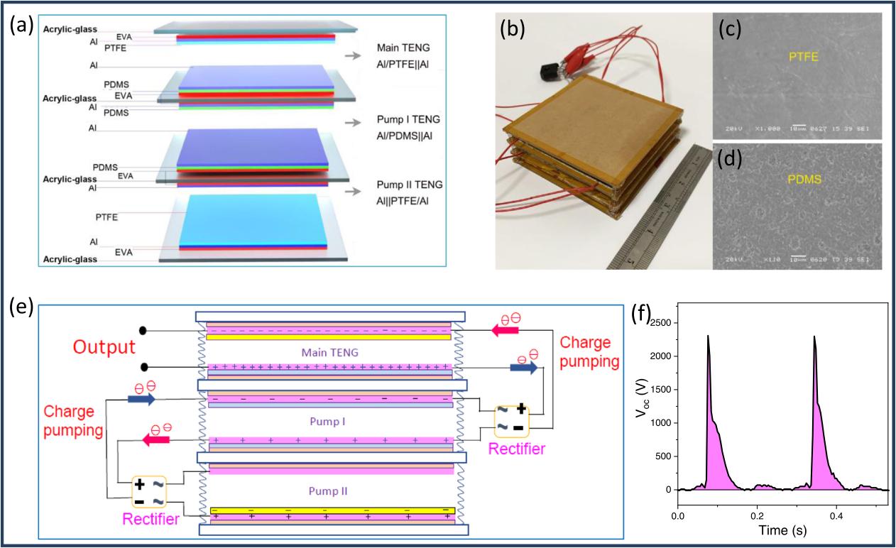 摩擦纳米发电机(TENG)于2012年首次提出,其工作原理是摩擦起电和静电感应,在机械能转化为有用电能方面,它是一种有效的清洁能源技术。目前,提高TENG的转移电荷密度和实现直流输出是其发展中的主要挑战。本论文提出了一种通过峰移修正电荷泵浦的超高电荷密度和直流输出的摩擦纳米发电机。TENG工作于接触分离模式,具有四层平行结构。该TENG具有2300 V的高开路电压、3 mA的高短路电流、150 mW的高功率和20μC的超高转移电荷,比单级泵送和非泵送的TENG有显著提高。TENG能够点亮发光二极管、驱动电子器件以及为涂料的电泳沉积提供电能,展现出在汽车电泳涂装方面的应用价值。这项工作为开发具有超高转移电荷的高性能直流TENG提供了一种新的方法。