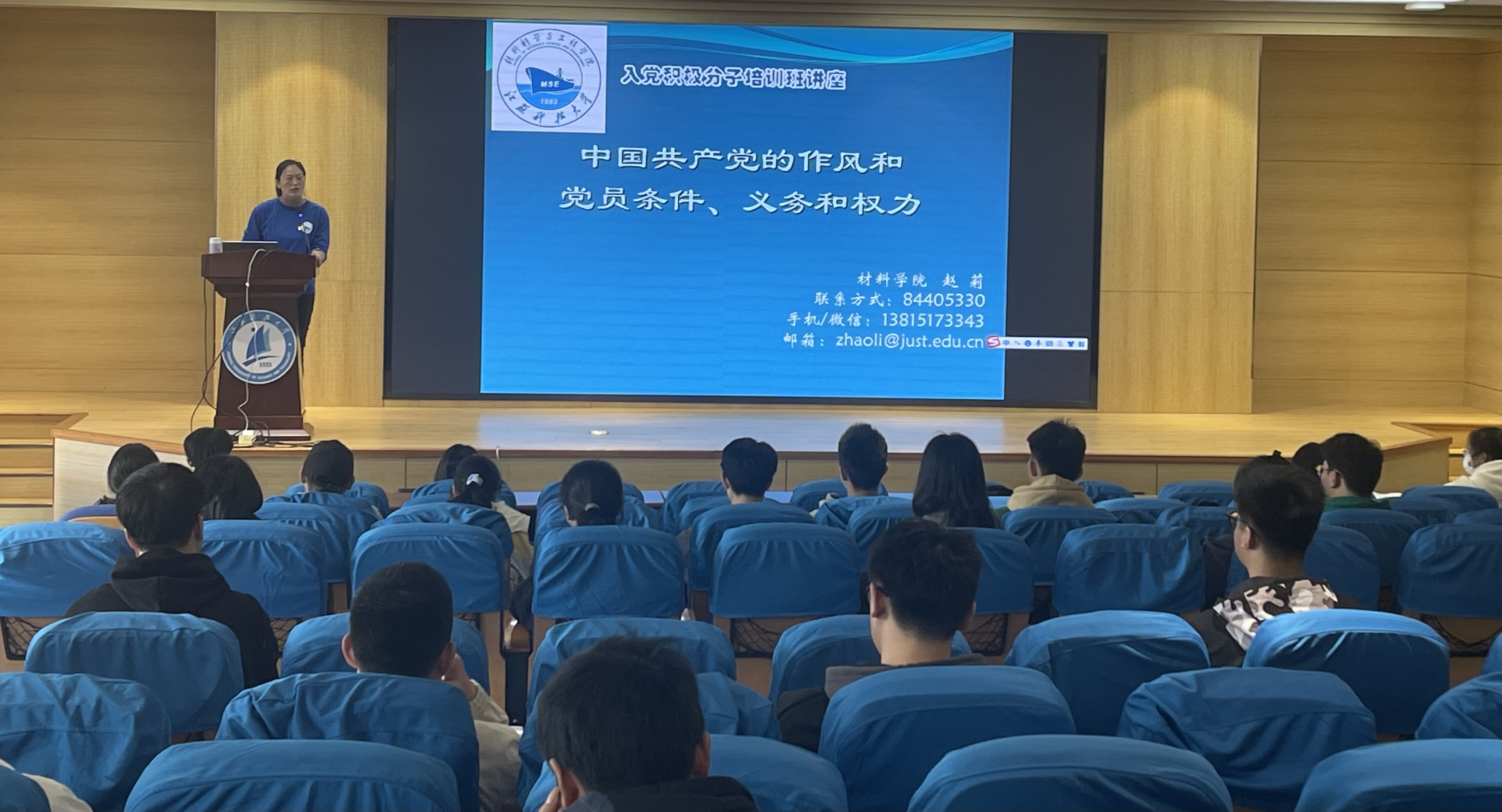 开班仪式结束后,学院党委副书记赵莉为全体学员讲授“中国共产党党员条件、义务和权利”专题党课。她深入浅出地讲解了中国共产党三大优良作风,对党章规定的党员标准、党员权利和义务进行了全面解读。