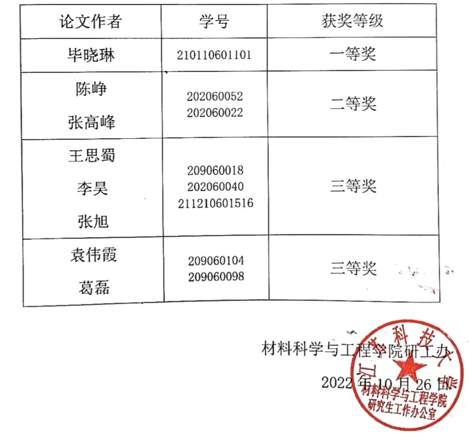 2022年10月26日下午,材料学院研究生院于材料楼512会议室举行了研究生学术论坛-优秀论文评比活动。本次活动主要面向材料学院博士和硕士研究生,评选工作邀请材料学院副院长李瑞峰、电子封装系主任王凤江、焊接系党支部书记胥国祥、周海俊担任活动评委。活动由材料学院研究生辅导员张世文主持。