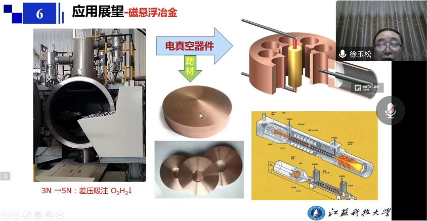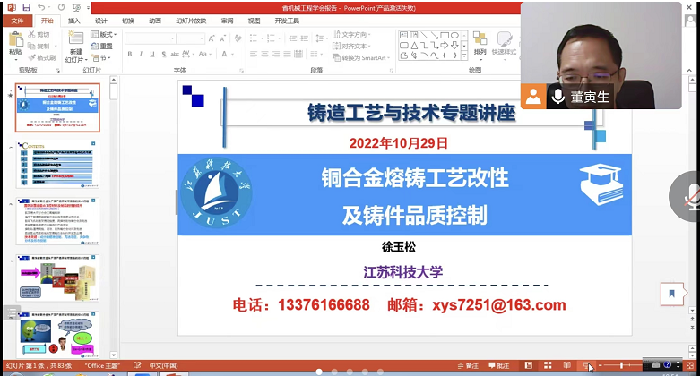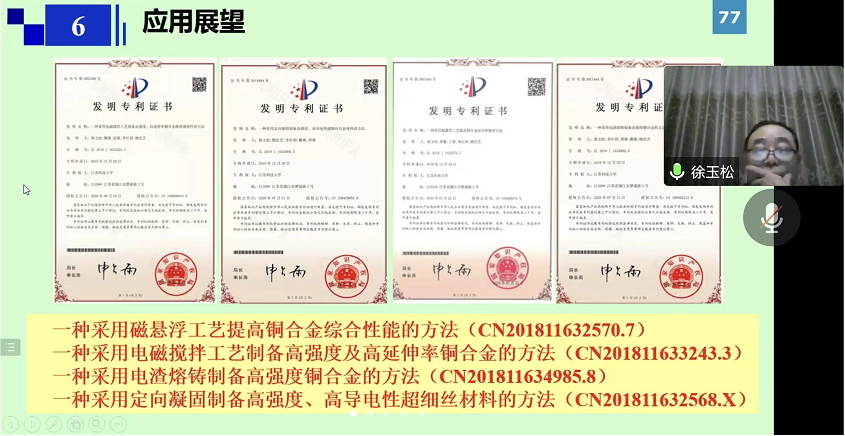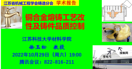 10月29日晚,我校材料科学与工程学院徐玉松教授在江苏省机械工程学会铸造分会的网络平台上作了“铜合金熔铸工艺改性及铸件品质控制”专题报告,江苏省机械工程学会铸造分会理事长、河海大学王泽华教授,铸造分会秘书长、东南大学董寅生教授、铸造分会常务理事、 芦笙教授、铸造分会常务理事、南京工业大学张振忠教授等铸造分会常务理事、理事20多人,以及江苏省内外铸造专家、铜合金领域的同行参与了学术活动。董寅生教授主持报告会。