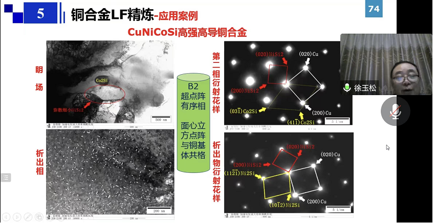 本次报告中,徐教授向同行展示了利用三维原子探针、高分辨透射电镜对铜合金样品观测的新发现,揭示了铜合金调幅分解的微观形貌与元素分部规律,以及4×10nm与铜基体共格的超点阵、有序分布的B2析出相。该系列研究成果受到了线上专家的高度重视和好评,展现了我校合金化材料及工艺研究的先进水平。报告结束后,徐教授和参会专家学者展开了热烈的互动交流。