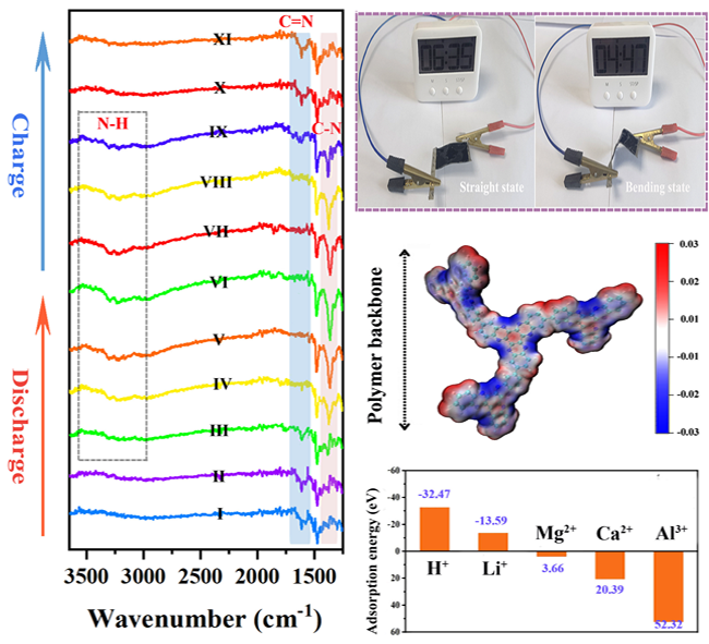 基于高分子材料结构多样性、分子可控性以及资源可持续性等优势,本论文设计了一种具有氧化还原活性位点的含氮杂环高分子聚合物,并构建了一种自支撑柔性电极材料。利用多种原位表征技术结合DFT理论计算等方法,证明了该电极材料具有快速、稳定、以及高效的质子储能特性。最后成功制造出一种高体积能量/功率密度和优异循环性能的柔性水系质子电池,适用于高安全性的便携式与可穿戴电子设备。本论文的研究成果不仅对高分子聚合物材料的研究具有指导意义,而且将为高性能储能器件的发展提供新思路。