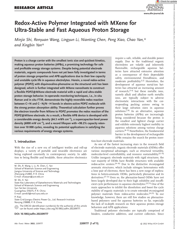 近日,材料学院施敏杰副教授为第一作者、晏超教授为第一通讯作者,以 为第一通讯单位,在Wiley出版社旗下材料领域顶级期刊《Advanced Functional Materials》(自然指数期刊,中国科学院一区TOP,影响因子19.92)上发表高水平研究论文“Redox-Active Polymer Integrated with MXene for Ultra-Stable and Fast Aqueous Proton Storage”。这是材料学院首次在该杂志上发表高水平学术论文,实现了我校材料学科的一个新突破,并将提高我校在高分子材料、功能材料等领域的影响力。
