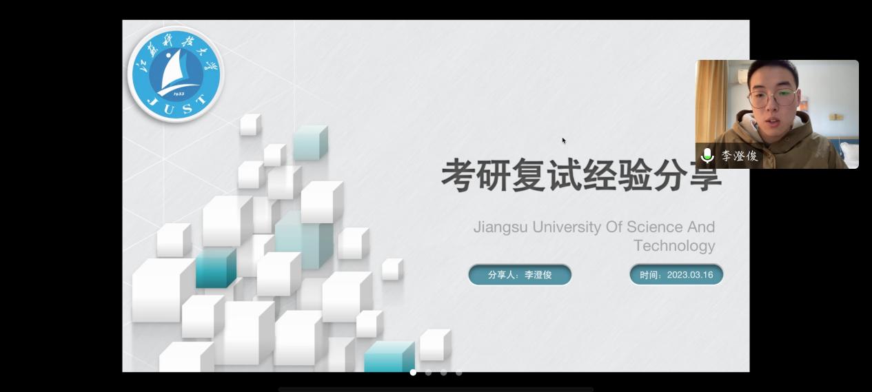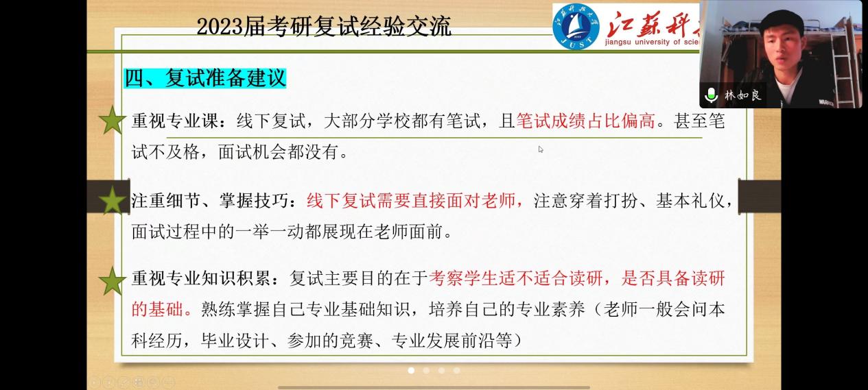 第三个环节由2022届升学学长进行复试经验分享,分别是山东大学林如良、大连理工大学李澄俊和我校张书华同学。三位学长从不同角度分享了自己复试的经验和心得,包括专业知识的重要性、复试时需要注意的细节、如何有效地进行调剂以及如何联系导师等方面。他们同时结合自身经历,列举了复试中可能遇到的困难和问题,让同学们有所准备。三位学长各有特色与侧重,提供多方面经验,帮助同学们取长补短、汲取经验。