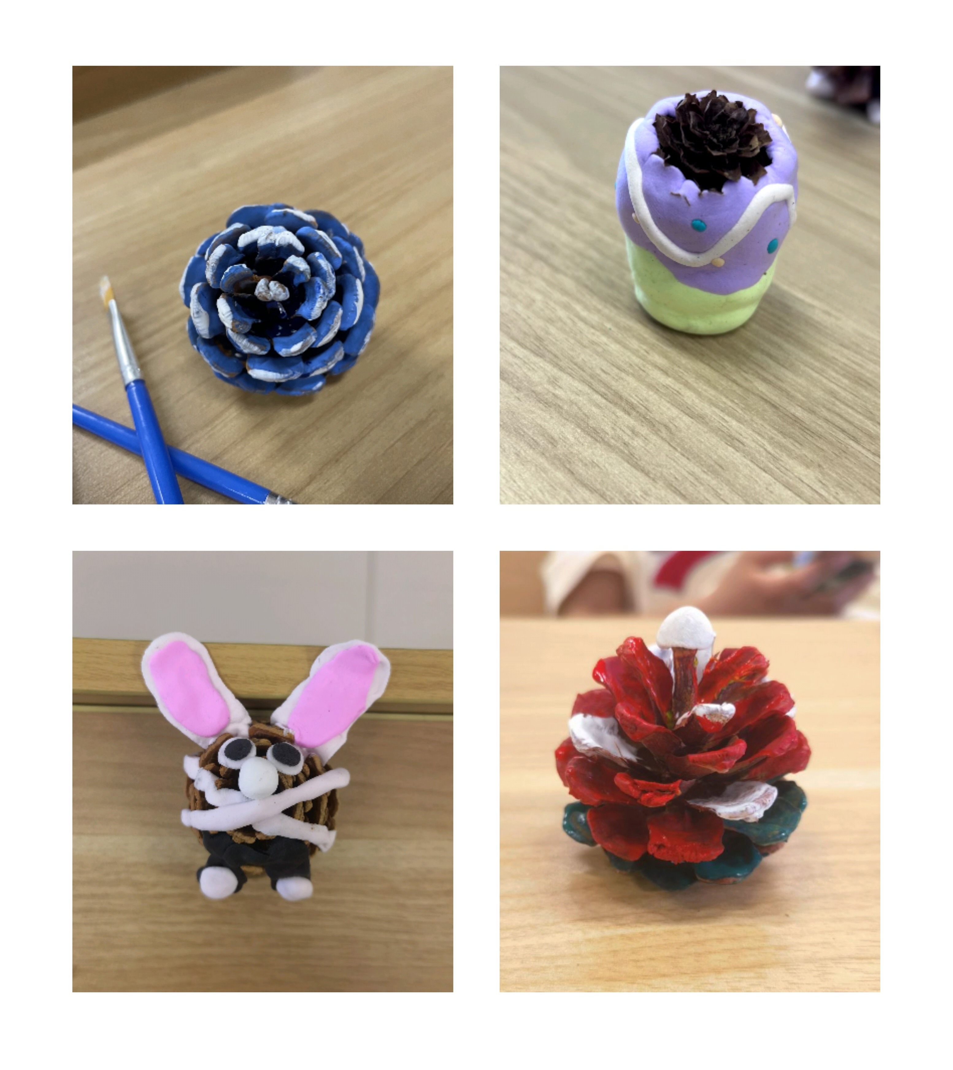 活动伊始,负责人首先向同学们介绍此次活动的流程。随后,同学们在活动负责人的引领下,有序挑选中意的松果并领取制作工具,正式开始了松果的制作过程。同学们发挥自己的创意和想象力,根据自己的想法对松果进行各样的装饰,松果在同学们的装饰下慢慢变成了不同的样子,装饰出来的不同的松果也寄予着不同的情感。经过接近一个小时的创作,同学们完成了自己的松果作品。每个同学的松果都充满了独特的创意和个性。在展示各自松果作品的环节中,同学们纷纷分享了自己的作品,同时毫不吝啬对其他作品的夸赞。