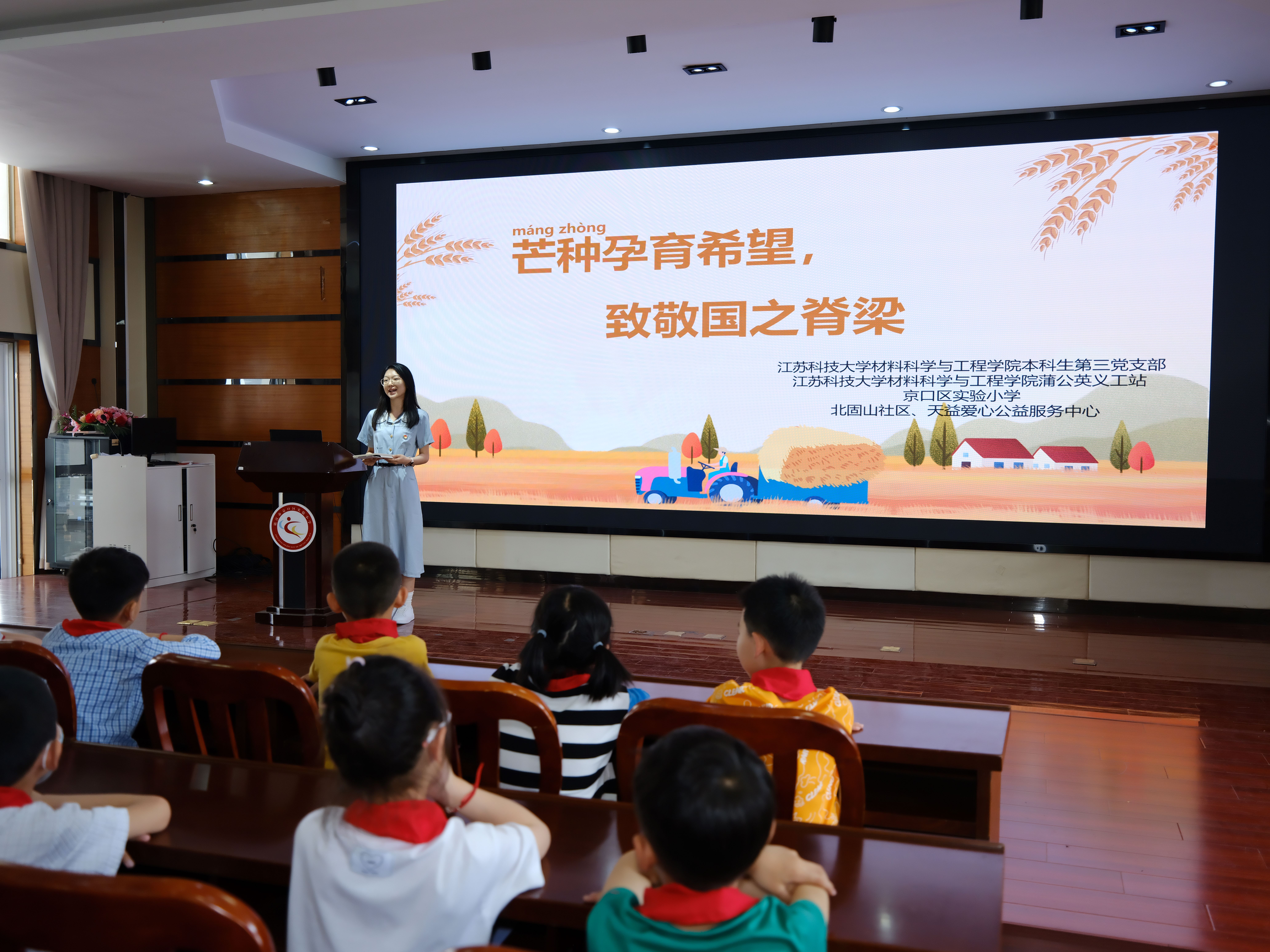 “时雨皆芒种,四野遍插秧,家家麦饭美,处处菱歌长”。芒种是二十四节气的第九个节气,标志着仲夏季节的正式开始。为进一步传承弘扬我国优秀传统文化,充分挖掘二十四节气的深厚历史文化底蕴,感受芒种节气的文化内涵和人文风俗,2023年6月2日, 材料学院本科生第三党支部、蒲公英义工站联合镇江市京口区实验小学、天益爱心公益服务中心以及北固山社区举办了“芒种孕育希望,致敬国之脊梁”主题活动。
