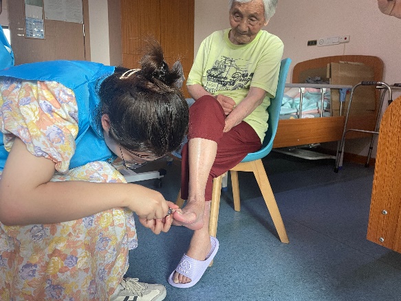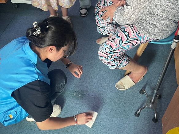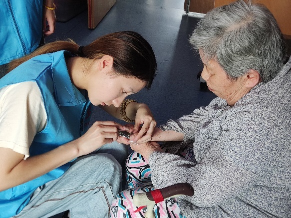 活动期间,孙新同学和周心怡同学一起帮爷爷奶奶整理好了床铺。黄芳同学协助养老中心的员工把一位行动不便的奶奶扶到轮椅上并推去洗澡。丁婷婷同学和孙新同学还帮几位奶奶剪了手指甲和脚趾甲。爷爷奶奶们都很健谈,虽然有些方言上的沟通不便,但是他们的笑容感染着团队成员,让他们明白爱的意义就是陪伴。