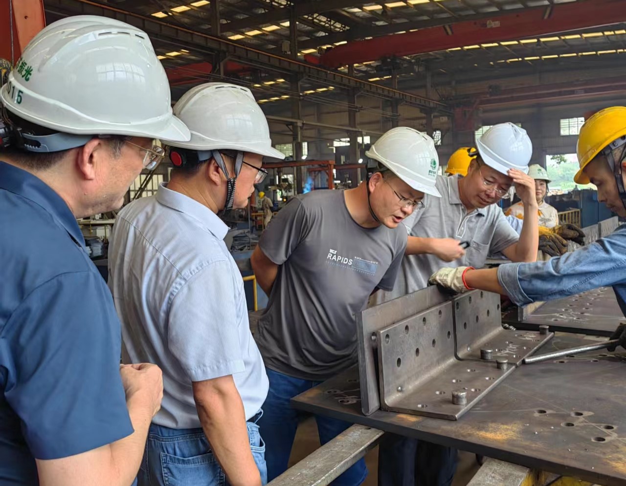 座谈交流后,时振董事长和芦笙院长一行走访了国电振光江苏振光电力设备制造有限公司,与公司负责人李代君高工进行了交流,并参观了焊接车间现场。通过三方的深入沟通交流,一致同意加强校企业产学研交流,加速推进输变电铁塔塔脚自动焊接产线、特高压输变电杆塔双工位缆式焊丝自动焊接等产学研项目合作,促进共同发展。