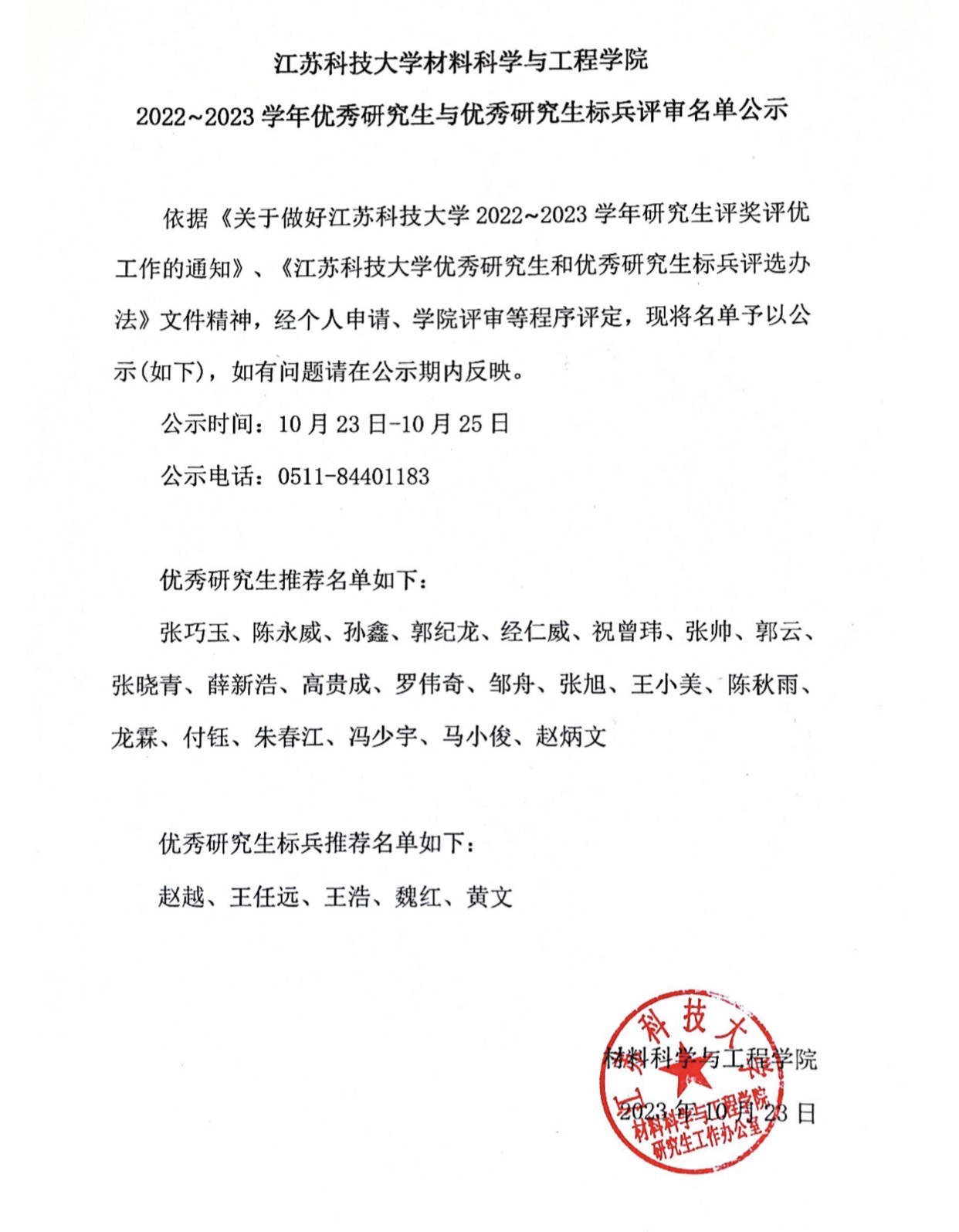 材料科学与工程学院2022-2023学年优秀研究生与优秀研究生标兵评审名单公示