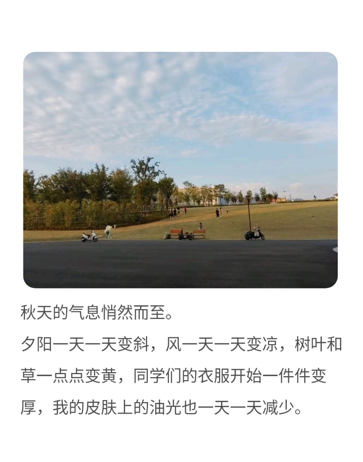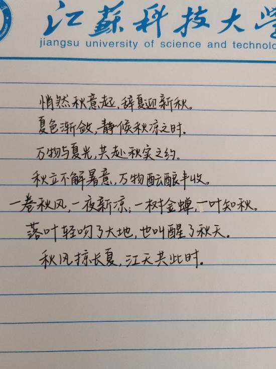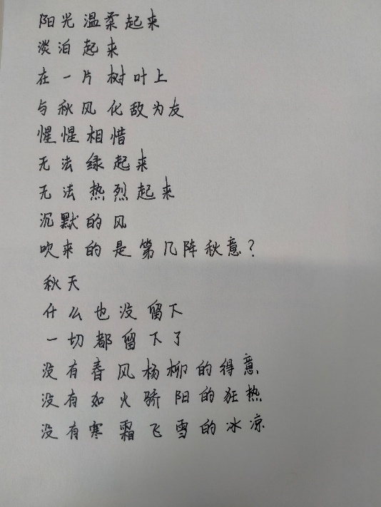 此次活动面向义工站全体义工,参与同学通过分享拍摄到秋日美景照片、录制秋天相关手作作品视频,亦或是手写关于赏秋赞秋的现代诗来参与活动。透过一张张照片,一段段视频,秋日美景的宜人风韵被展现的淋漓尽致。或是高楼小桥之侧的红叶萧萧,或是阡陌田垄之间的果实累累,无不诉说着同学们眼中的美好秋日。阅读同学们所写诗歌,字里行间无不是对秋景的欣赏和对秋日的赞美,秋日的馈赠随着悠长的意境播撒于每一位同学的心间。