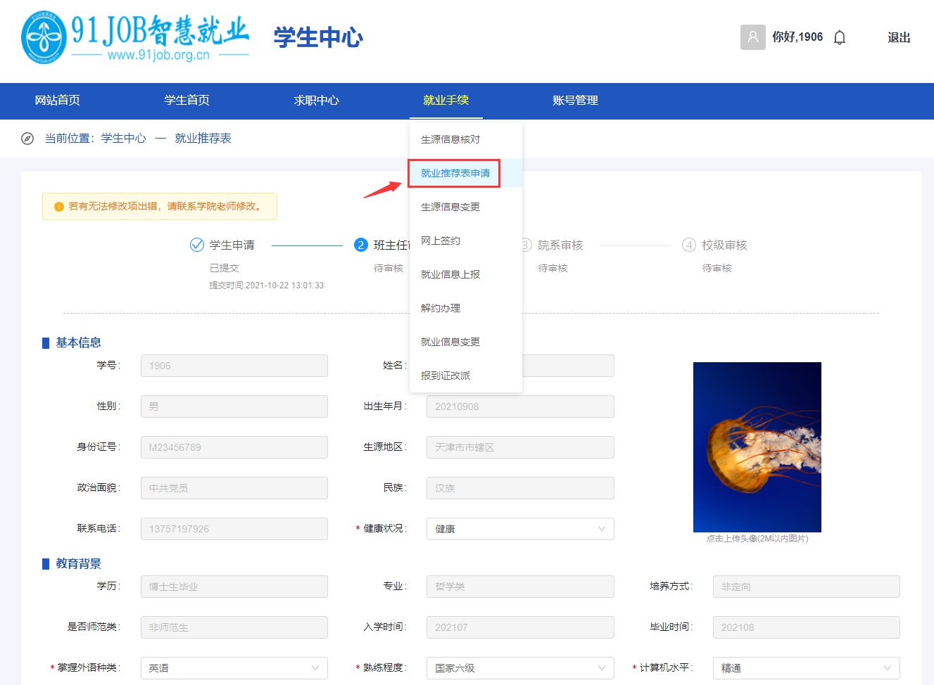 学生提交就业推荐表申请,待学校审核通过后,由学校打印就业推荐表和空白协议书。填写健康状况、教育背景、在校期间任职情况等相关信息,提交成功后,等待学校审核。