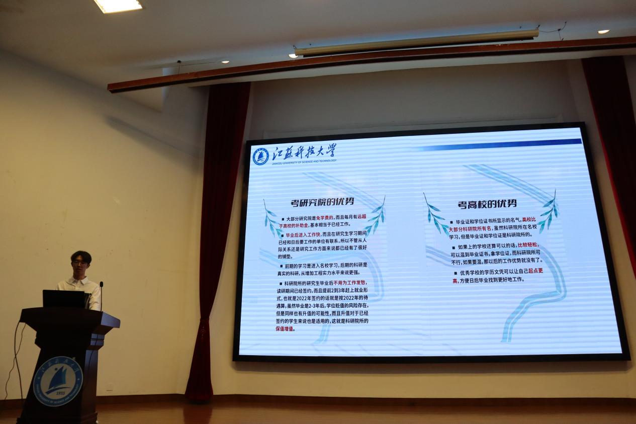 功能材料的王钥瑶学姐首先对功能材料专业进行了全方位的讲解;其次她从三个方面讲解自己的学习历程,从大一逆袭的她,担任多个干部职务,以就业道路为目标,一步一个脚印,锻炼了自己的组织和领导能力。她认为同学们应当以终点的心态来规划起点,明确自己的职业目标,并通过参加实习和竞赛等活动,提升自己的竞争力,建议同学们选择什么样的道路,就不断往那个方向前进,制定计划,不盲目的学习。同时,她分享了自己的志愿奖项与各类证书,希望同学们不应将自己的目光仅仅局限于书本之上的倡议。她以自己的亲身经历告诉同学们,大学生可以拥有更为广阔的舞台,在不耽误自己的学业的情况下,不断参加与组织活动既是对社会的回报,也是自我能力的提升,更是以后同学们谈天说地的资本。最后王钥瑶学姐以“生逢盛世,勇担使命,心怀家国”的话语激励我们不断地前行。