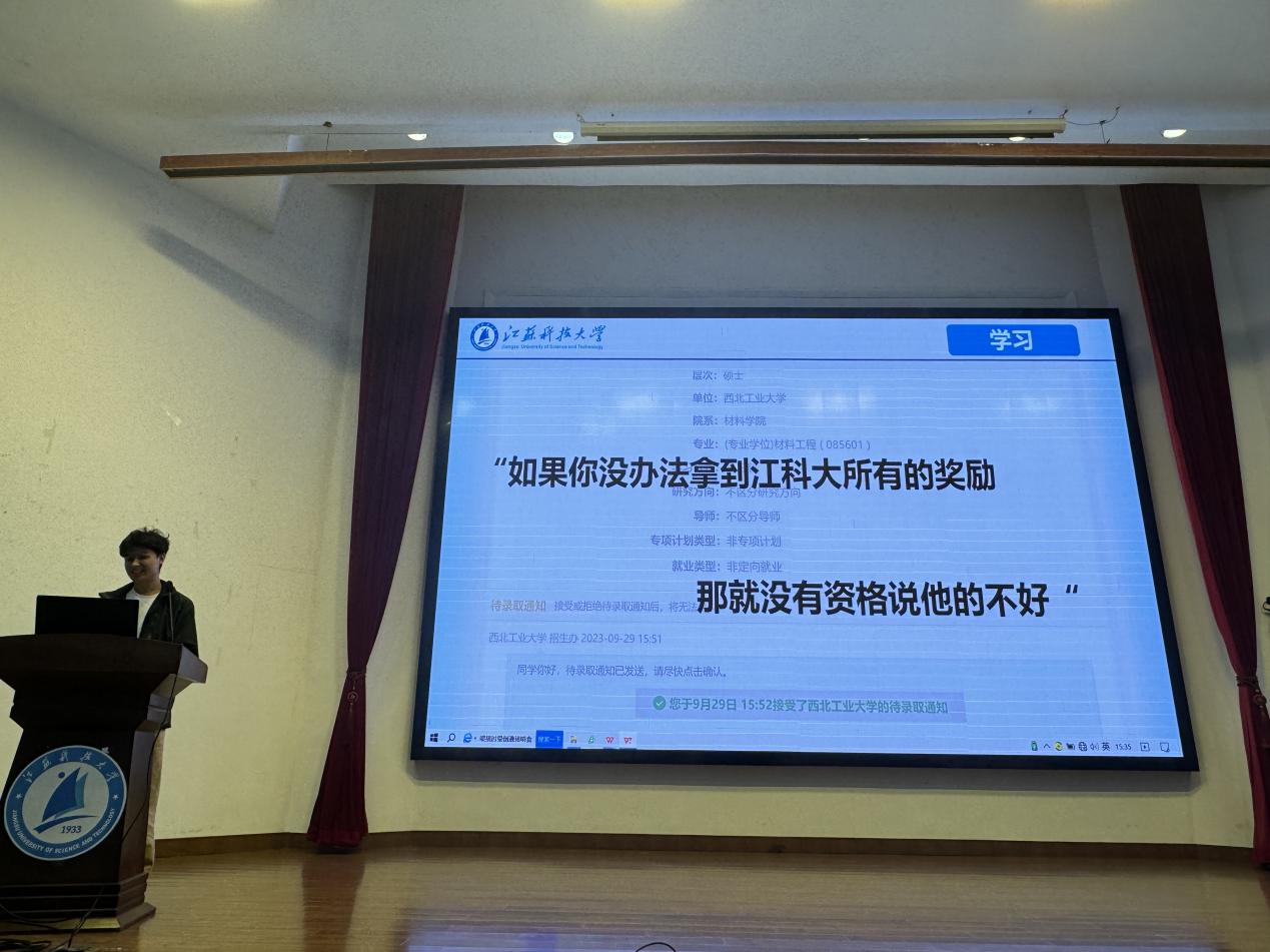 焊接材料的王佳才学长在学习与竞赛方面分享了自己的心得体会,以自己在学业上的优异成绩和竞赛经验为依托,向同学们传授了学习和竞赛备战的宝贵经验。分享了他的导师曾对他们说的一句话“要以金奖的标准要求自己,那金奖一定是我们的!”要时刻以更高的标准要求自己。同时他认为,不拖延、保持积极、规律作息和合理安排任务是大学学习生活中的必备的良好习惯,只有坚持到底,才能收获属于自己的来之不易的成功。学长的话语助力同学们在学业和竞赛中不断提升综合素质,体现团结进取、追求卓越的精神风貌。