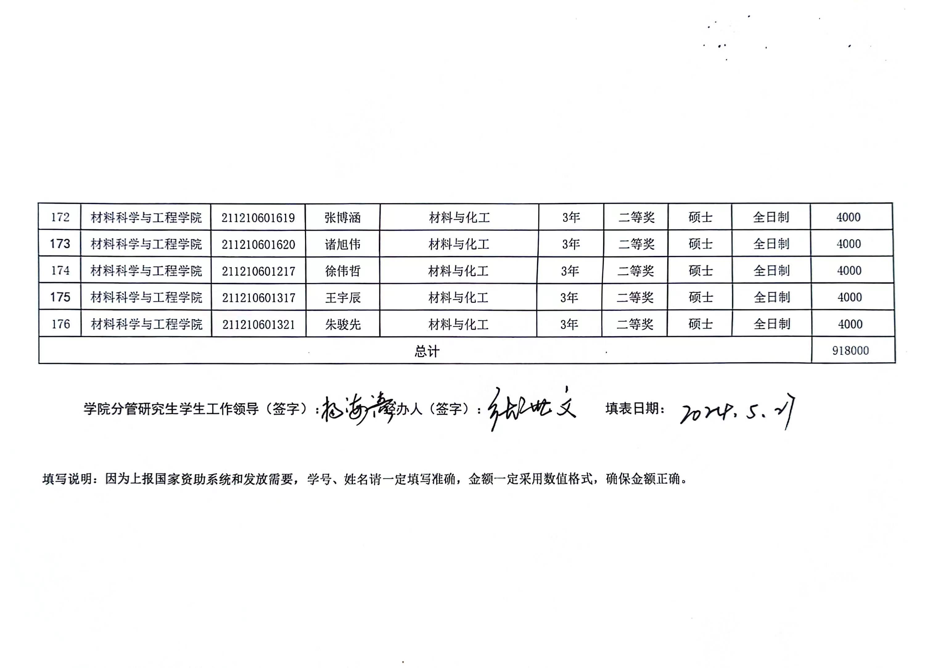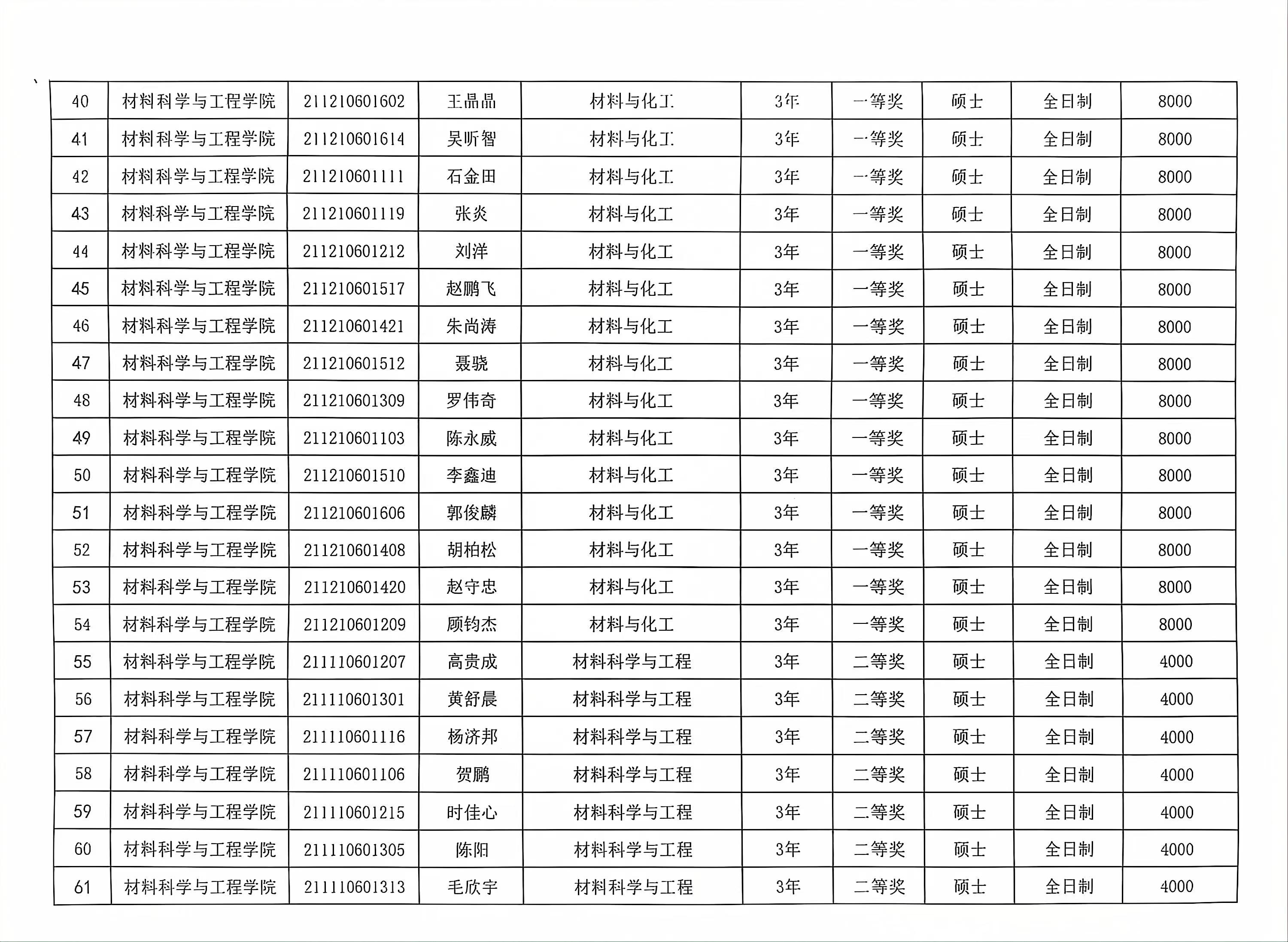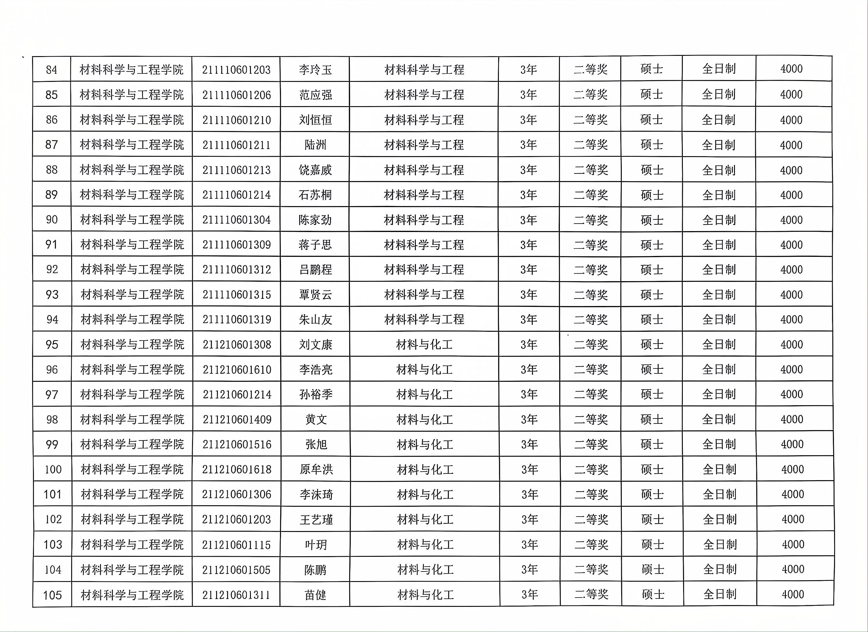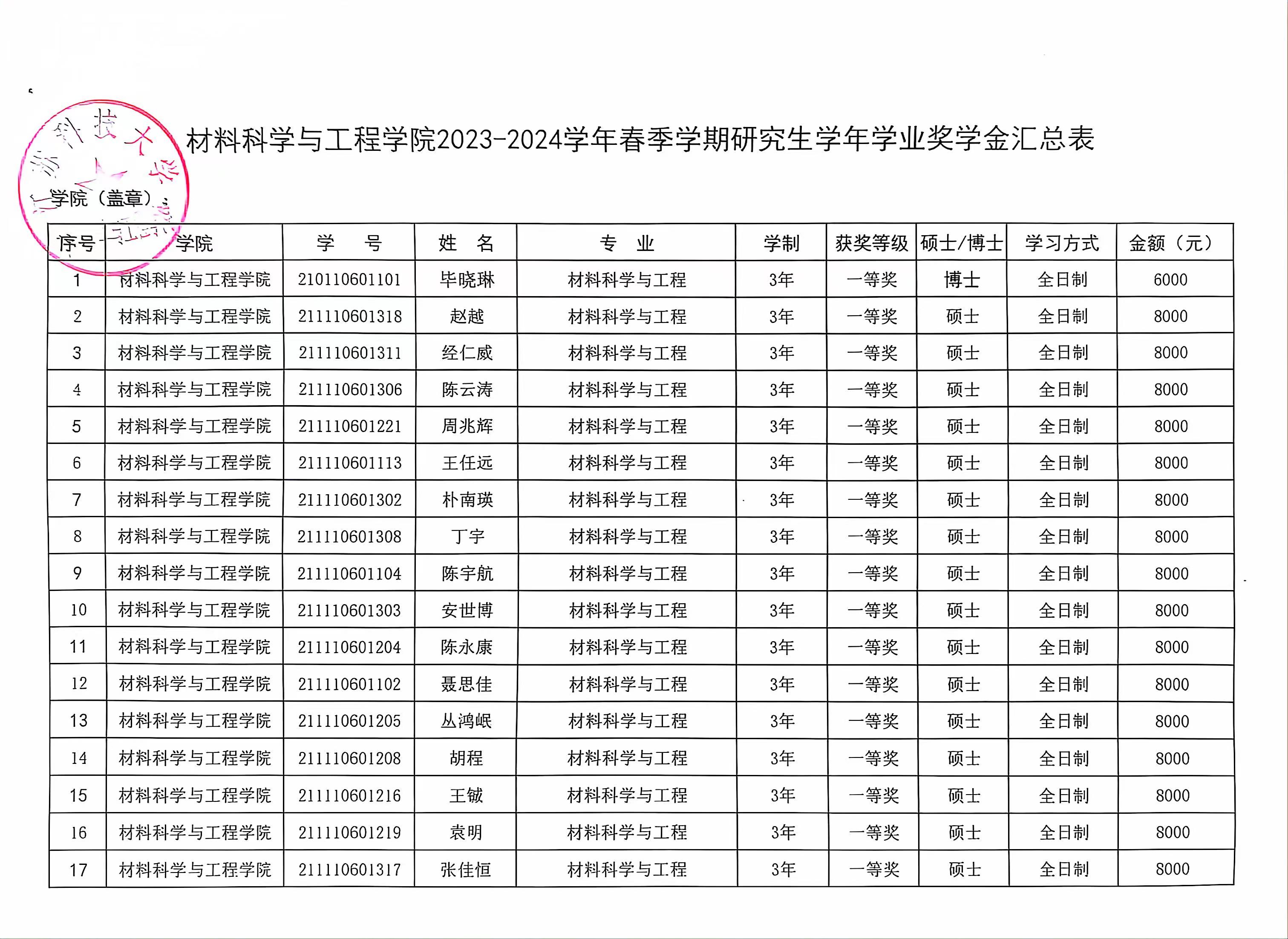 材料学院2023-2024学年春季学期研究生学业奖学金公示