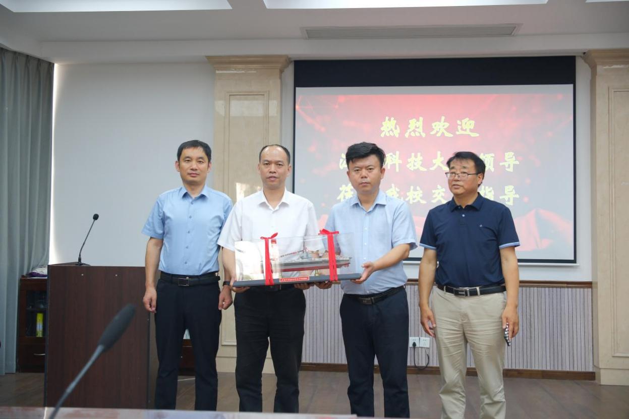在淮安中学,校党委书记、校长于敏,副校长王新南热情接待了叶永林一行。于敏对 人才培养质量、为船舶海工和国防事业做出的贡献表示肯定,特别感谢了我校举办的“我的大学 我的梦”主题研学活动。他表示,学生通过研学活动感受大学的魅力,在研学中开阔眼界,砥砺奋进,增加了报考我校的热情。叶永林代表学校向淮安中学近年来对我校招生工作的支持表示感谢,并向淮安中学赠送了中国人民解放军海军福建舰船模一套。