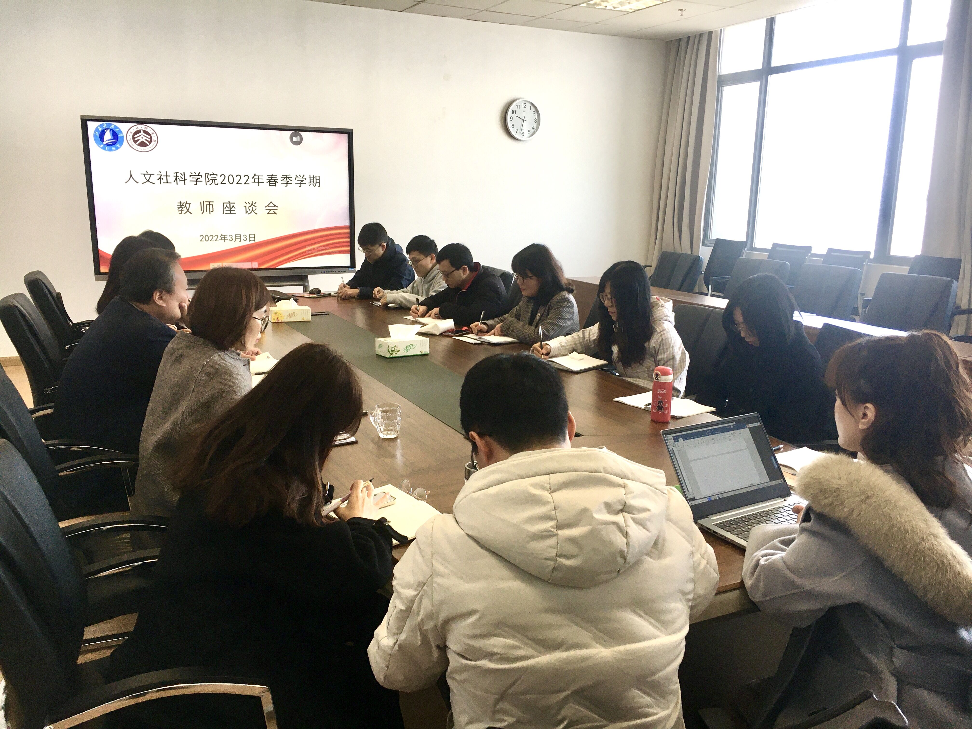 为深入了解教师思想动态,进一步统一思想、鼓舞士气,人文社科学院于3月3日上午在学院2046会议室召开2022年春季学期教师座谈会。座谈会由学院党委书记李明睿主持,院长张浩、党委副书记姜彦彦、新进教师及青年教师代表参加了本次座谈会。