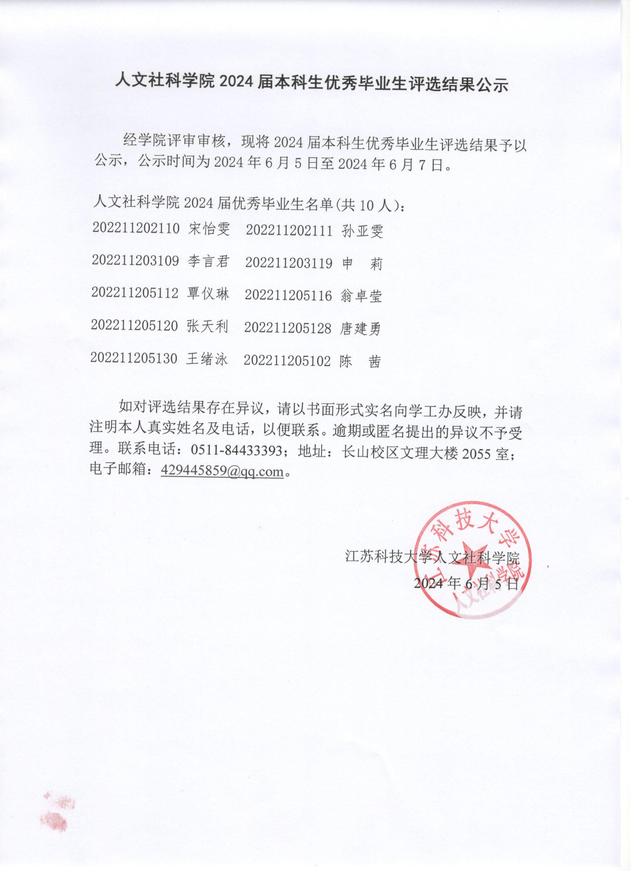 人文社科学院2024届本科生优秀毕业生评选结果公示