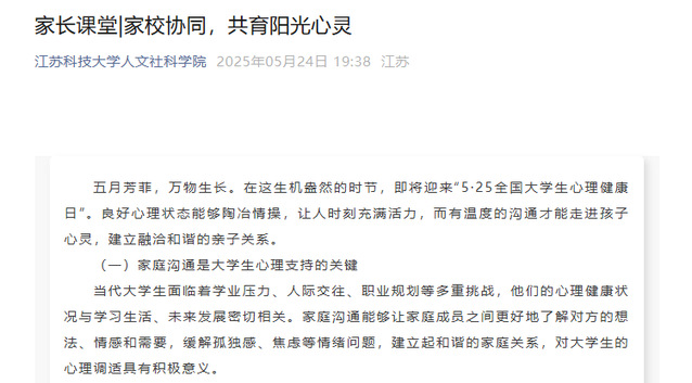 针对当代大学生与家庭沟通的现实需求,学院在官方公众号特别推出家长课堂专题推文。文章聚焦“代际沟通”这一普遍性问题,结合心理学理论,系统介绍了“倾听优先”“共情表达”等实用沟通技巧。通过专业指导,帮助家长更好地理解大学生的心理特点和需求,促进家庭建立良性互动机制,有效缓解异地求学带来的亲情疏离感。这篇推文不仅传递了专业知识,更成为连接两代人情感的温暖纽带。