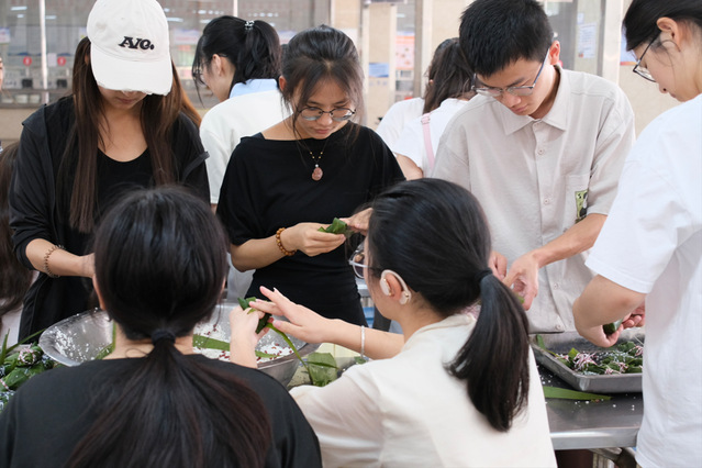 活动伊始,同学们在专业师傅的示范指导下,将翠绿的粽叶卷成锥形,填入晶莹的糯米与香甜的红枣,从最初的手忙脚乱到逐渐成型,百余个形态各异的粽子不仅承载着端午祝福,更凝结着多元文化的智慧交融。